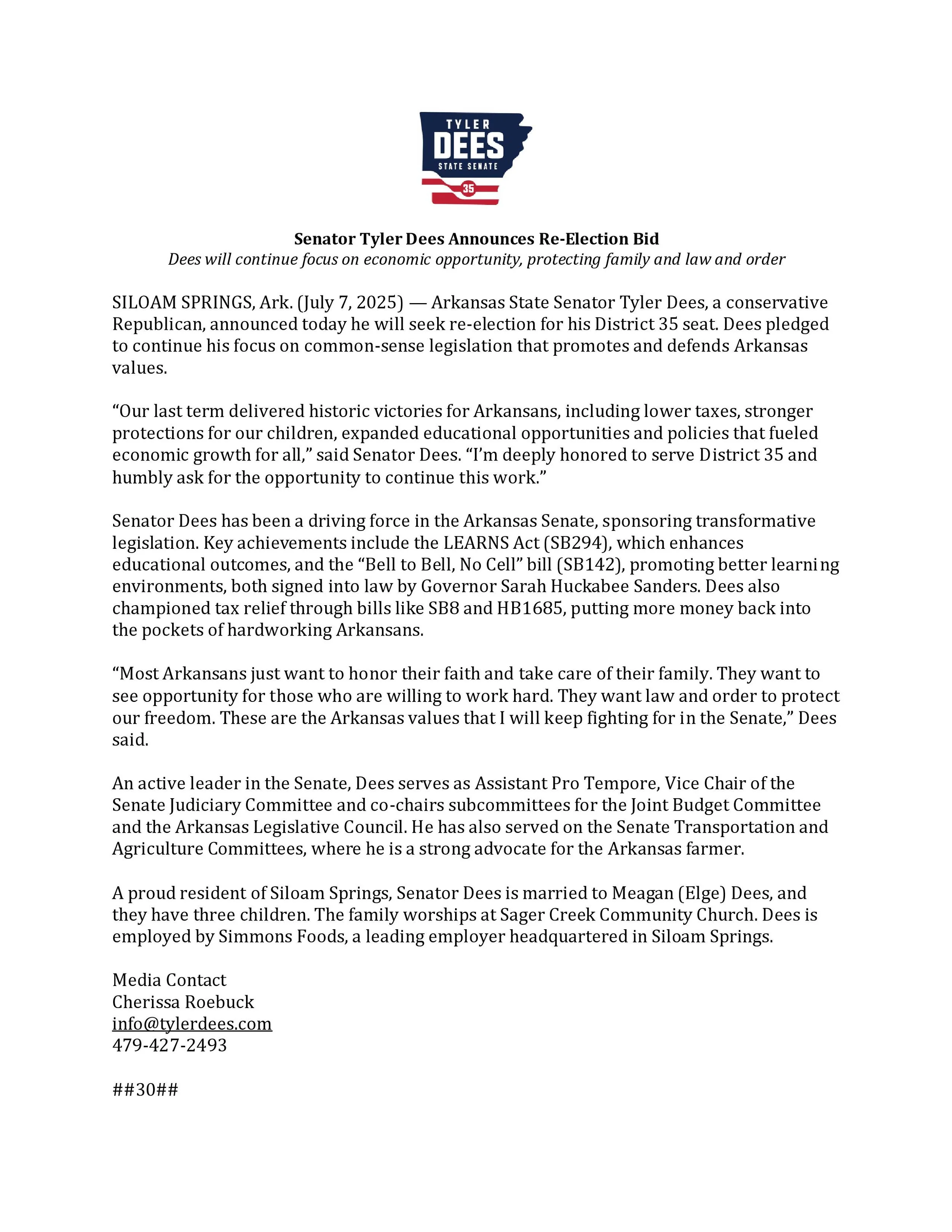 Tyler Dees, a lifelong Republican, is ready to take his conservative values, business acumen and passion for strong communities and families to represent district 35 in Little Rock.